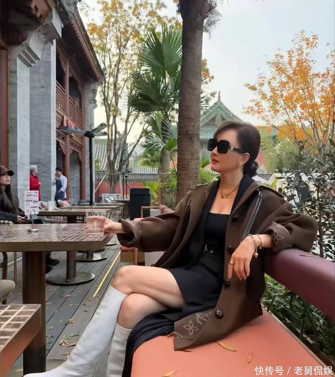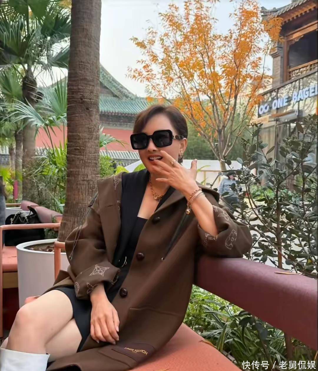 照片里的牛莉状态好到让人惊叹,低丸子头搭配香奈儿墨镜,简约又不失格调,倚靠在长椅上的姿态自带贵妇气质。